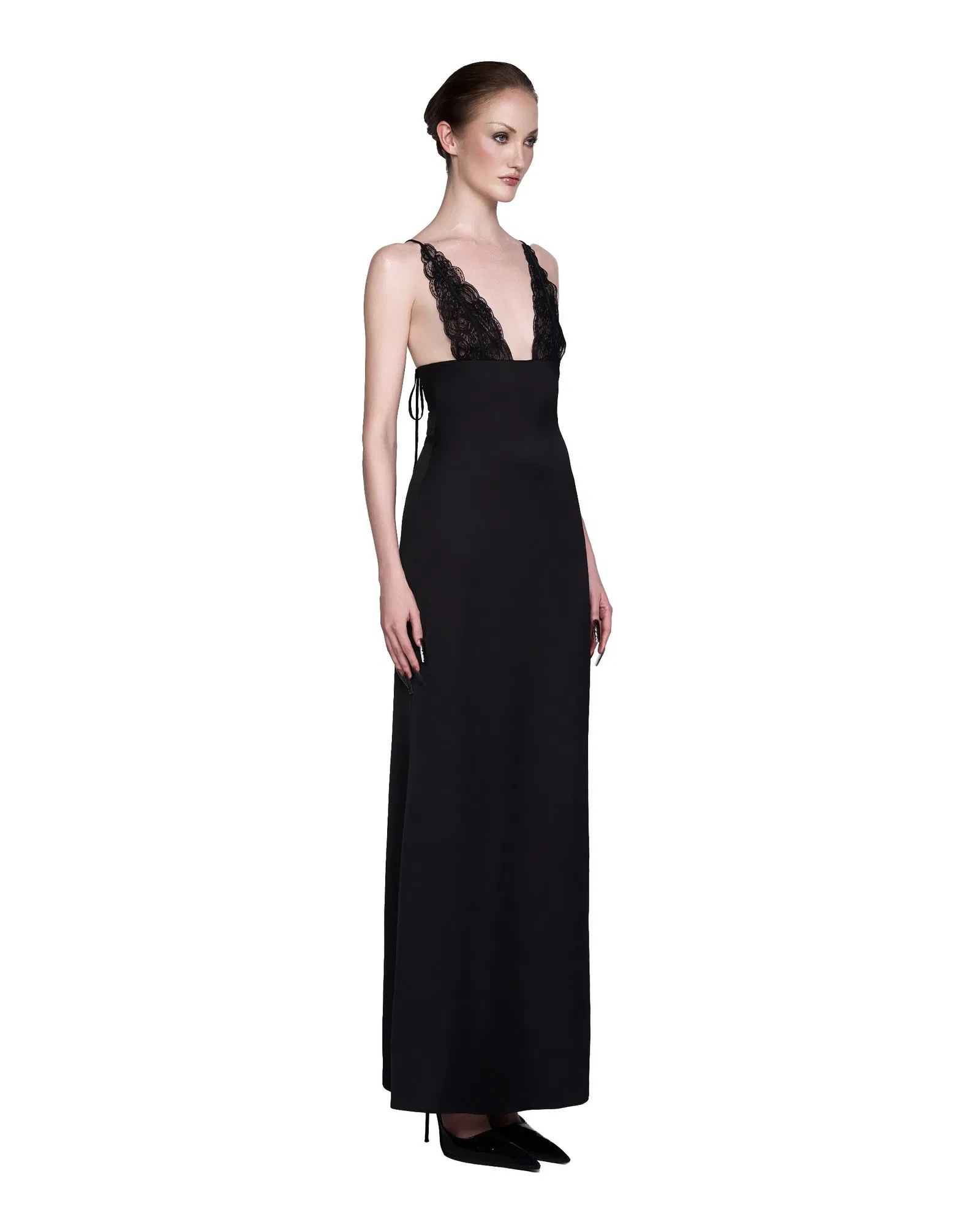 The bust area is designed with sheer black lace detailing.