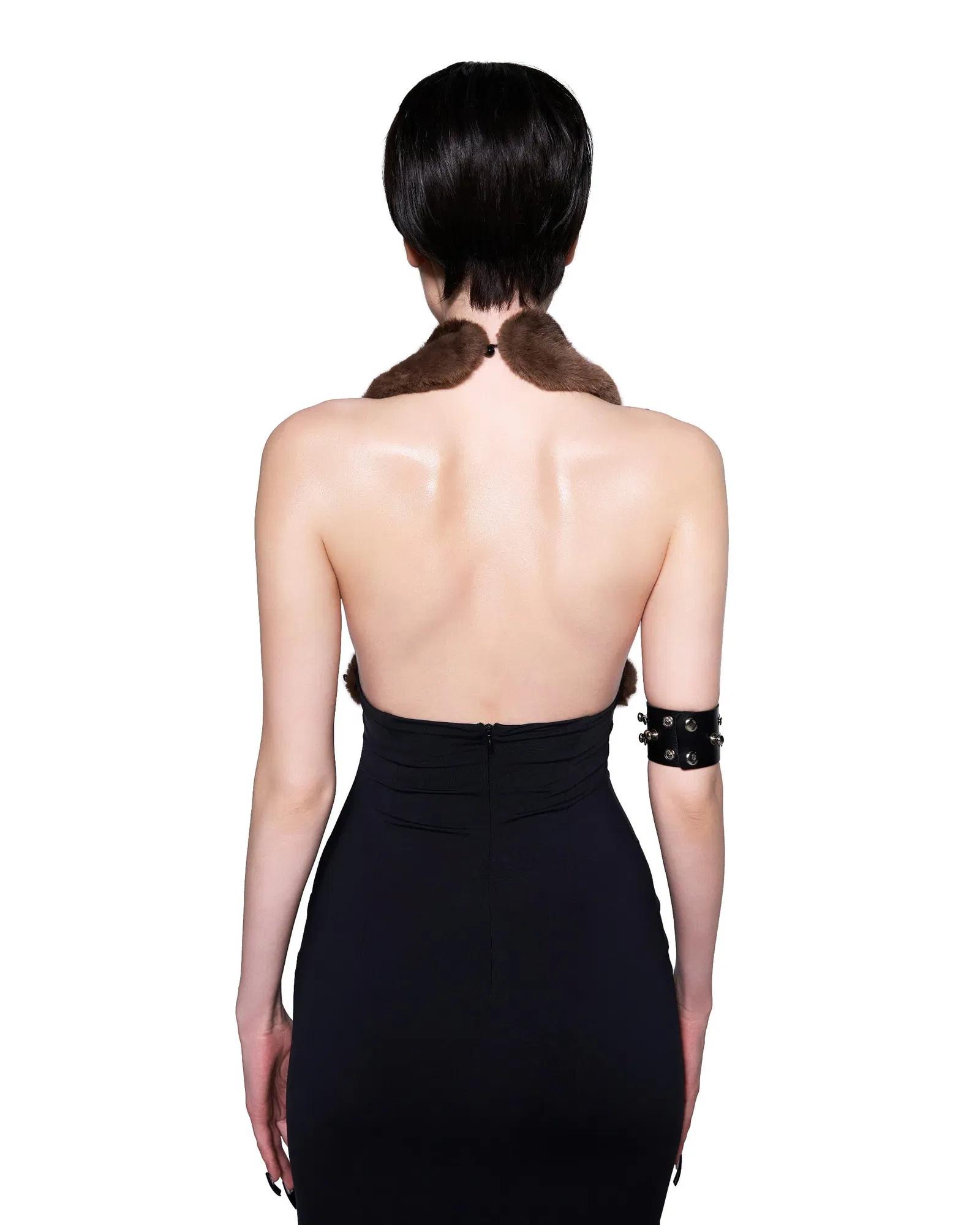 Cut-out at the chest, detailed with khaki strap, metal studs and faux fur.