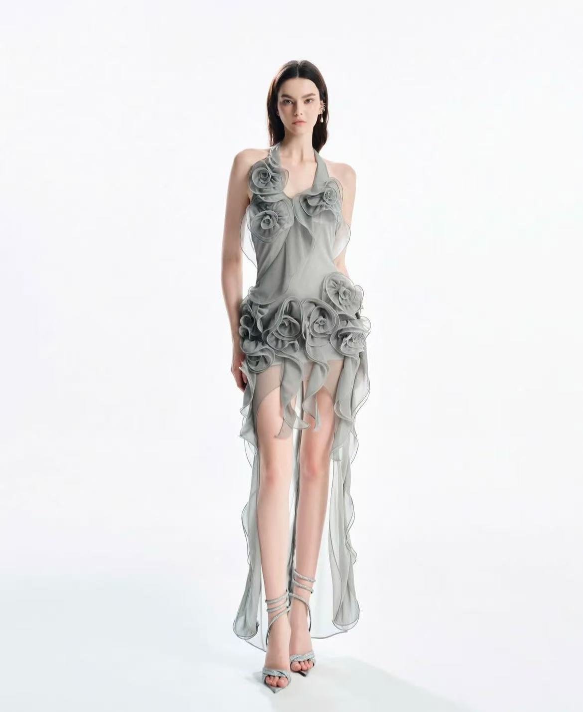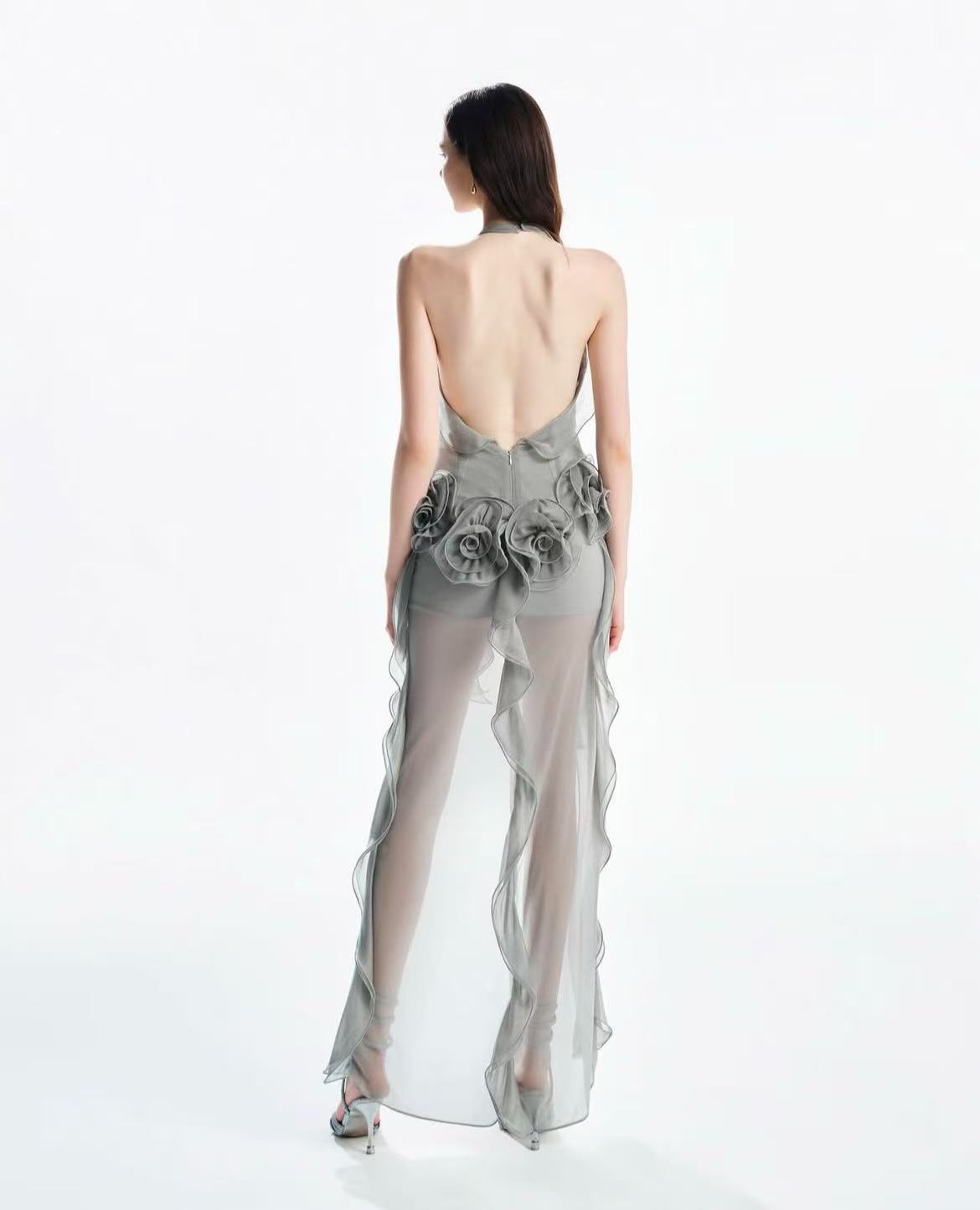 – Halter neck, Long length, Sheer effect with nude lining, 3D- Floral